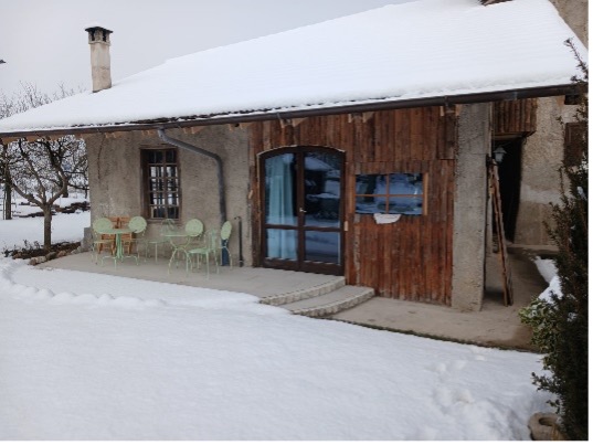 Die Terrasse vor einem Tischtennisraum, hier mit Schnee.